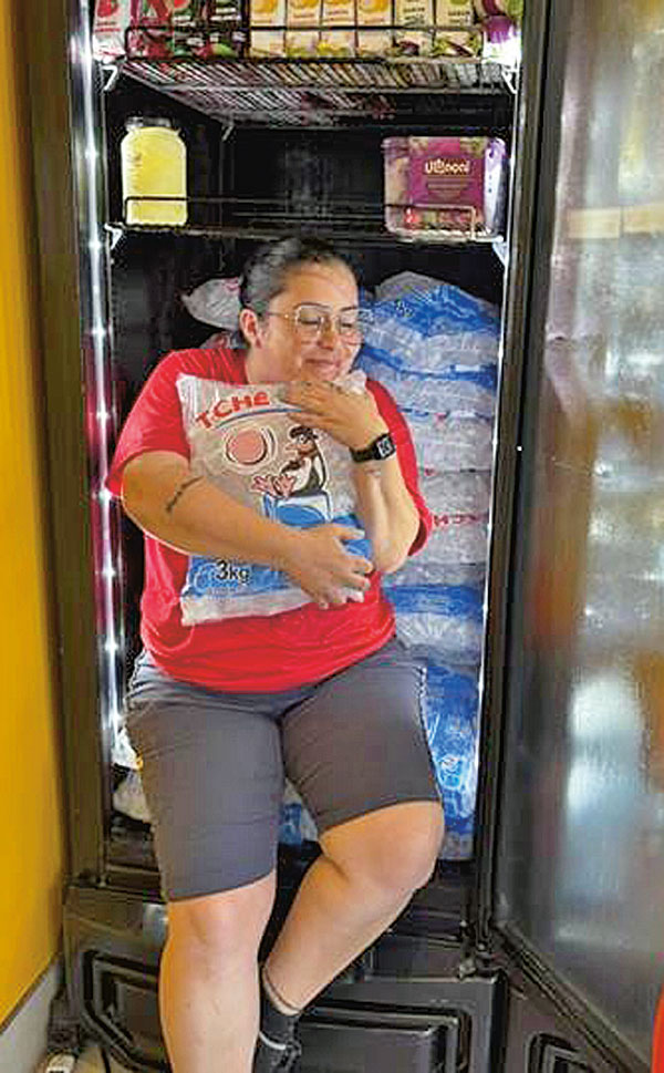 Marilian Tavares se refrescando com gelo em um freezer