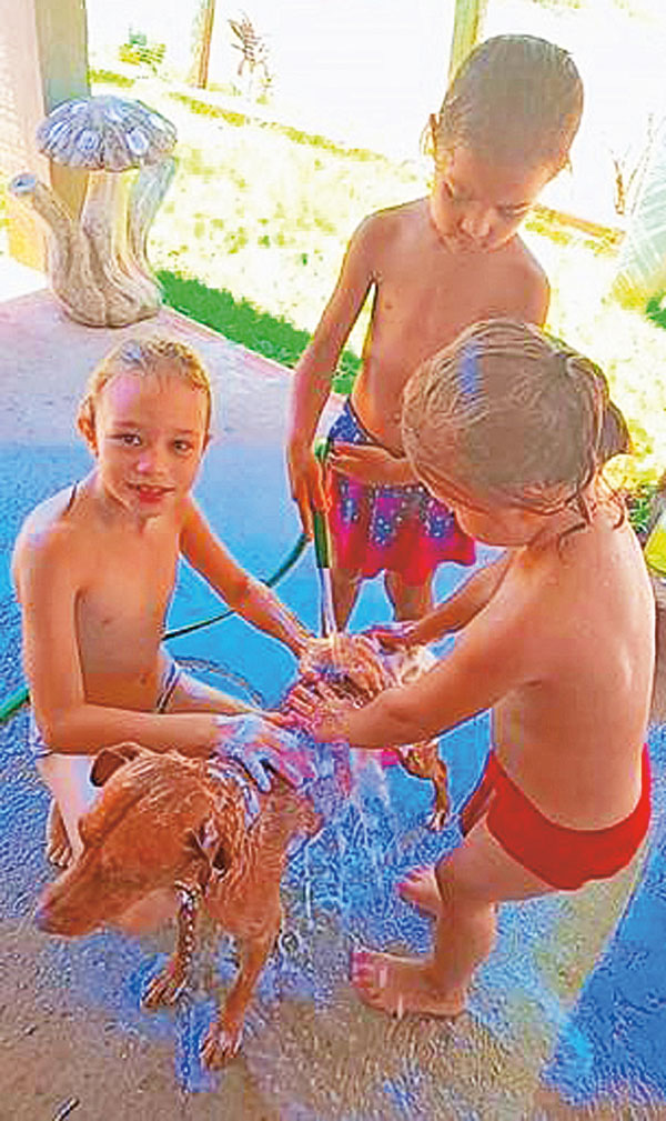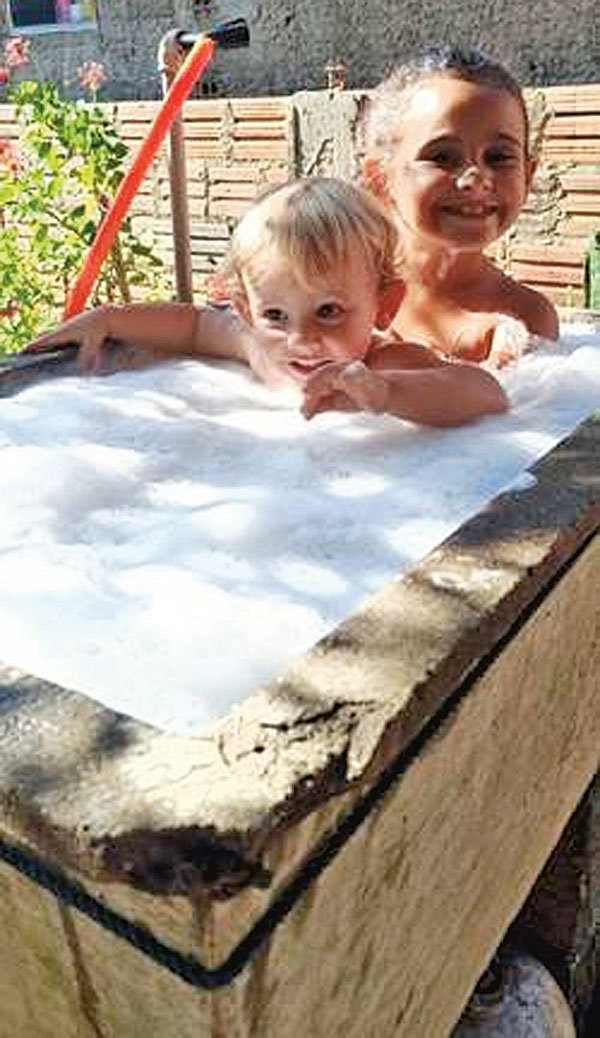 Maria Clara e João Pedro tomando banho em um tanque