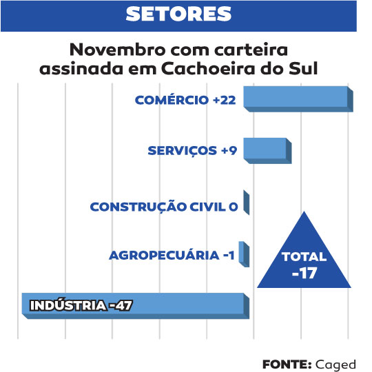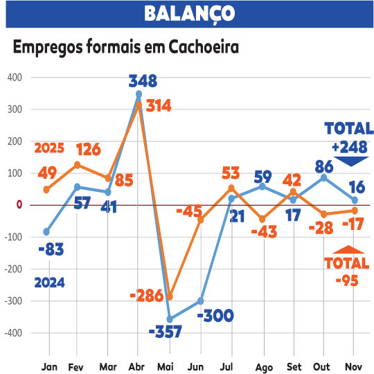 O mercado de trabalho cachoeirense perdeu 17 vagas formais em novembro, segundo os dados do Cadastro Geral de Empregados e Desempregados (Caged), divulgados nesta semana pelo Ministério do Trabalho e Emprego. Foram 330 admissões contra 347 desligamentos.