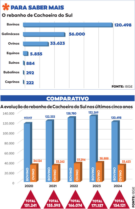 Desenvolvida pelo Instituto Brasileiro de Geografia e Estatística (IBGE) com base nas declarações anuais de rebanho, a Pesquisa da Pecuária Municipal (PPM) mostrou que Cachoeira do Sul teve uma baixa de 8,1% em seu somatório de bovinos, ovinos, bubalinos, equinos, galináceos, caprinos e suínos de 2023 para 2024. Foram contabilizados pelo IBGE 217.374 animais no ano passado, 19.120 a menos do que os 236.494 de 2023.