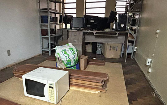 Além disso, o porão da Casa de Cultura virou depósito de material de informática pertencente ao Poder Executivo, como monitores, teclados, gabinetes de computadores, impressoras e até um forno micro-ondas. O ambiente é insalubre e, ainda que tenha um portão de ferro que impede a entrada de pessoas que não trabalham no local, estava aberto no dia da visita.
