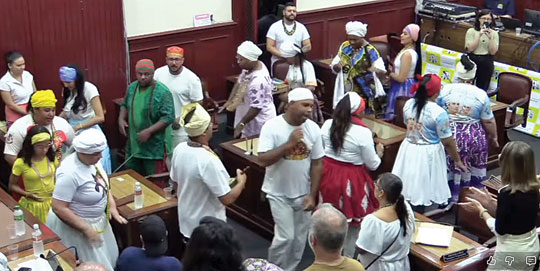 A deputada Luciana Genro lembrou que o toque do tambor, frequentemente alvo de denúncias e reclamações, é sagrado e protegido por lei, destacando documento emitido pelas Defensorias Públicas que garantem a liberdade de culto. “Não se tratam de brigas de vizinhança. O toque do tambor é sagrado e precisa ser respeitado. A lei garante liberdade às religiões de matriz africana, mas a falta de orientação, visibilidade e o preconceito fazem com que ela não seja cumprida”, afirmou.